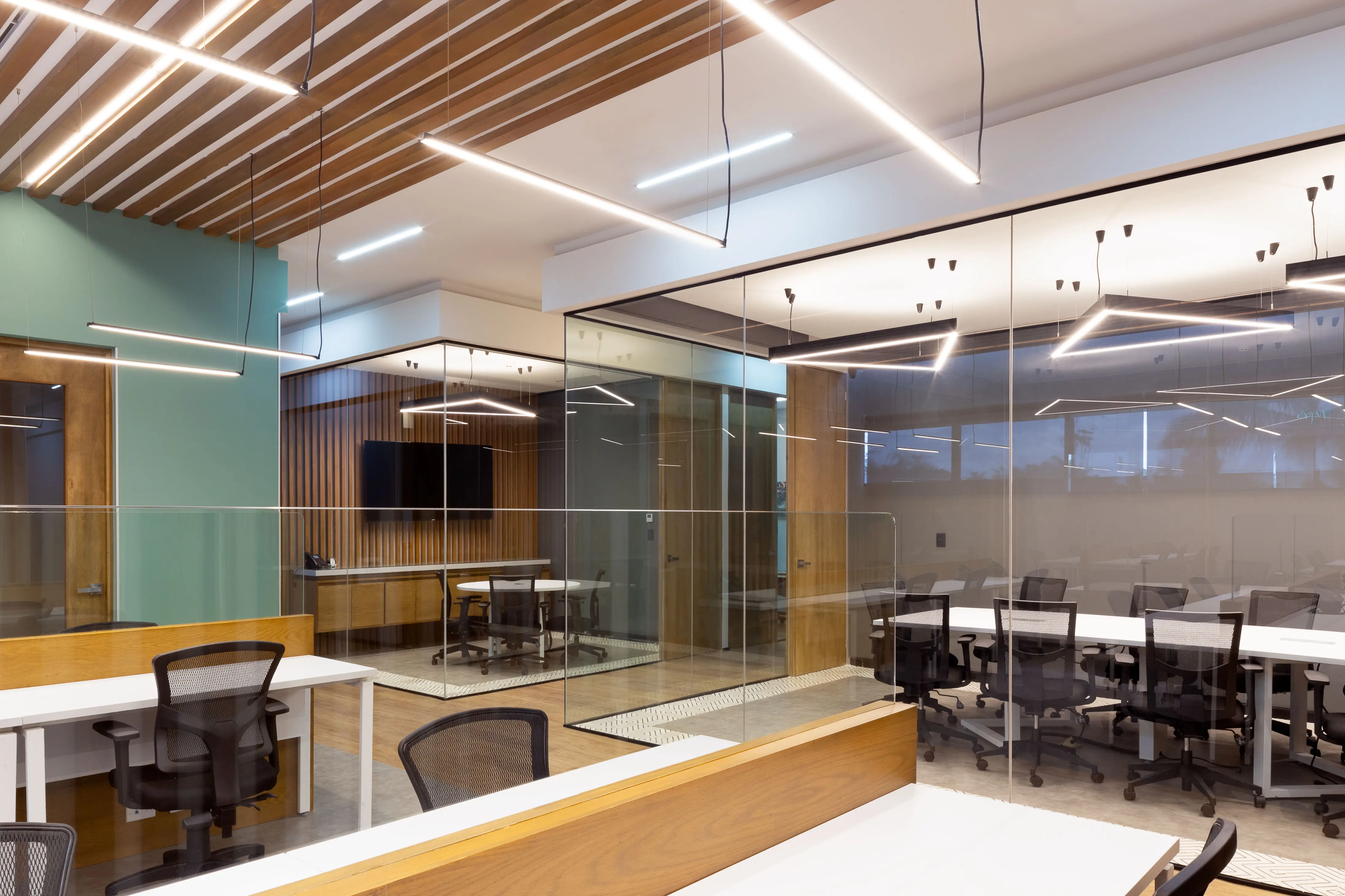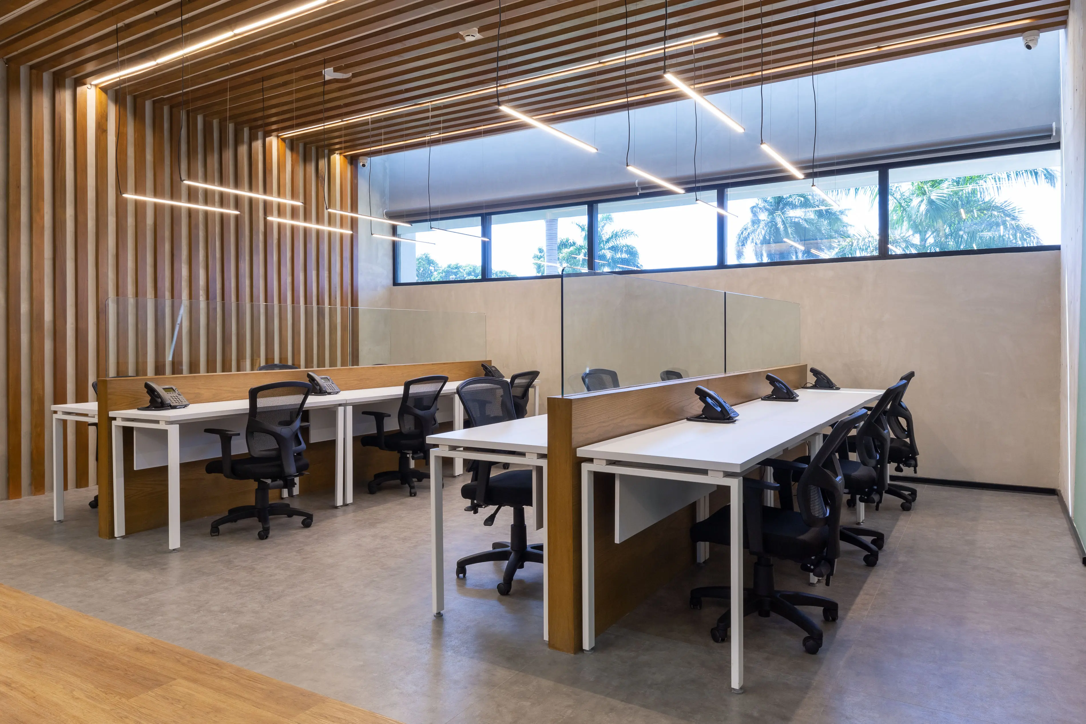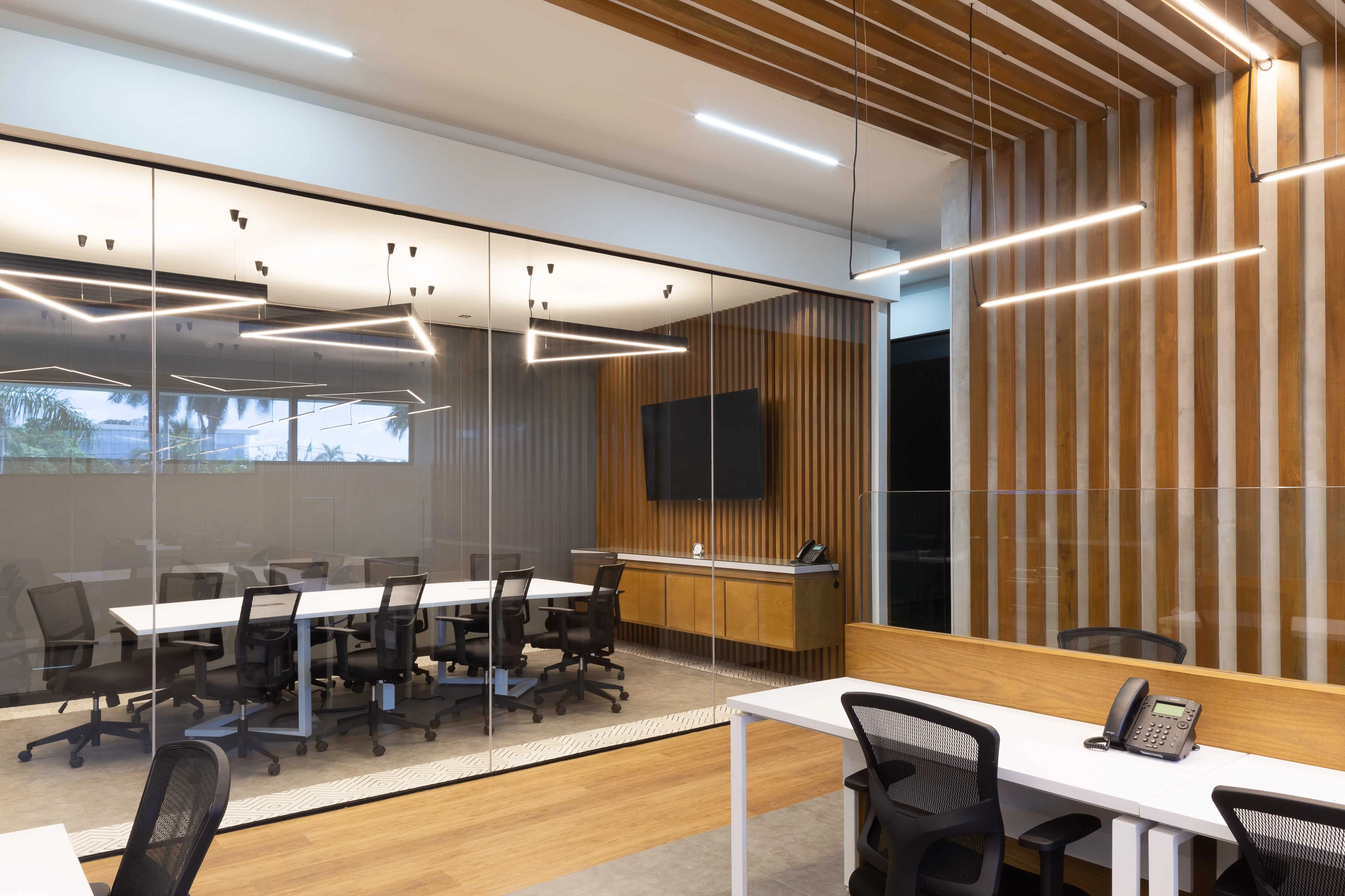 El proyecto integra oficinas privadas, coworking y salas de juntas dentro de un entorno sofisticado que equilibra diseño y funcionalidad.