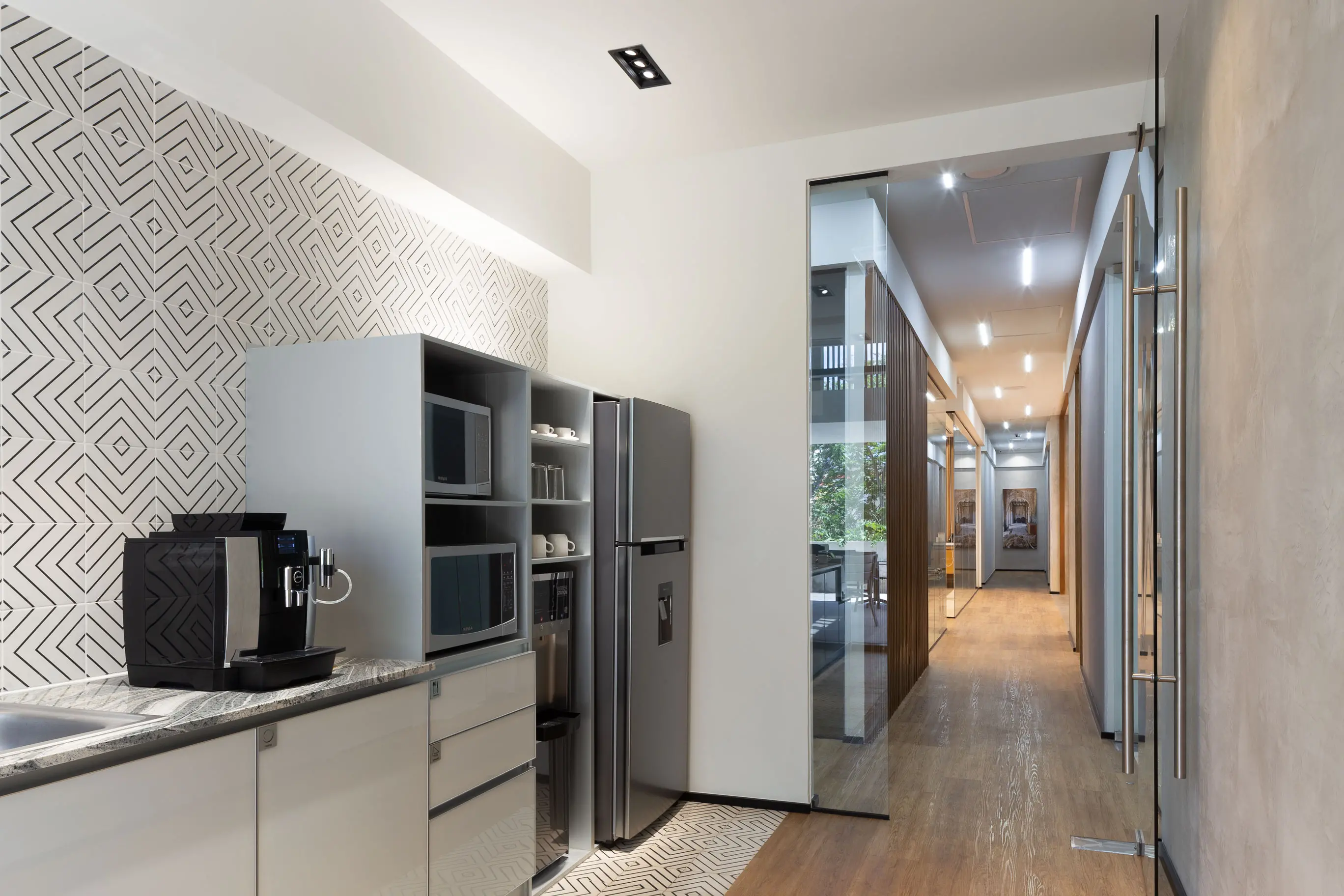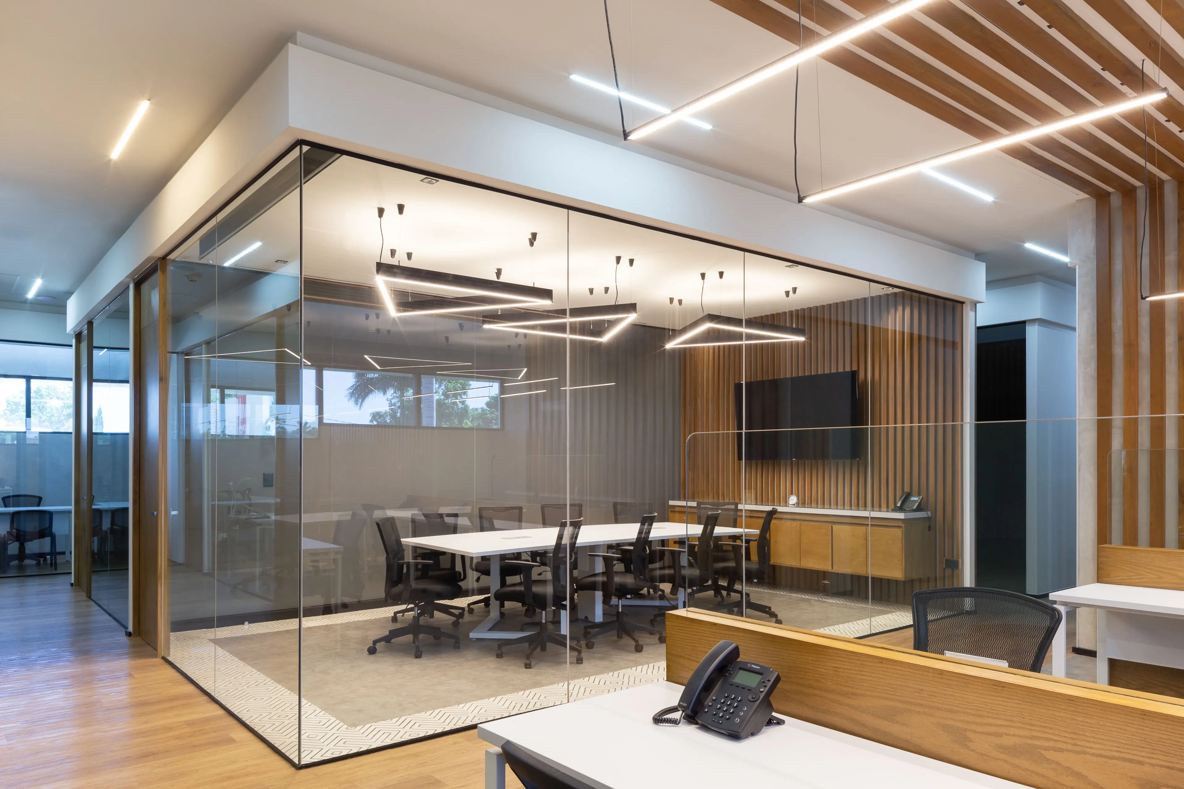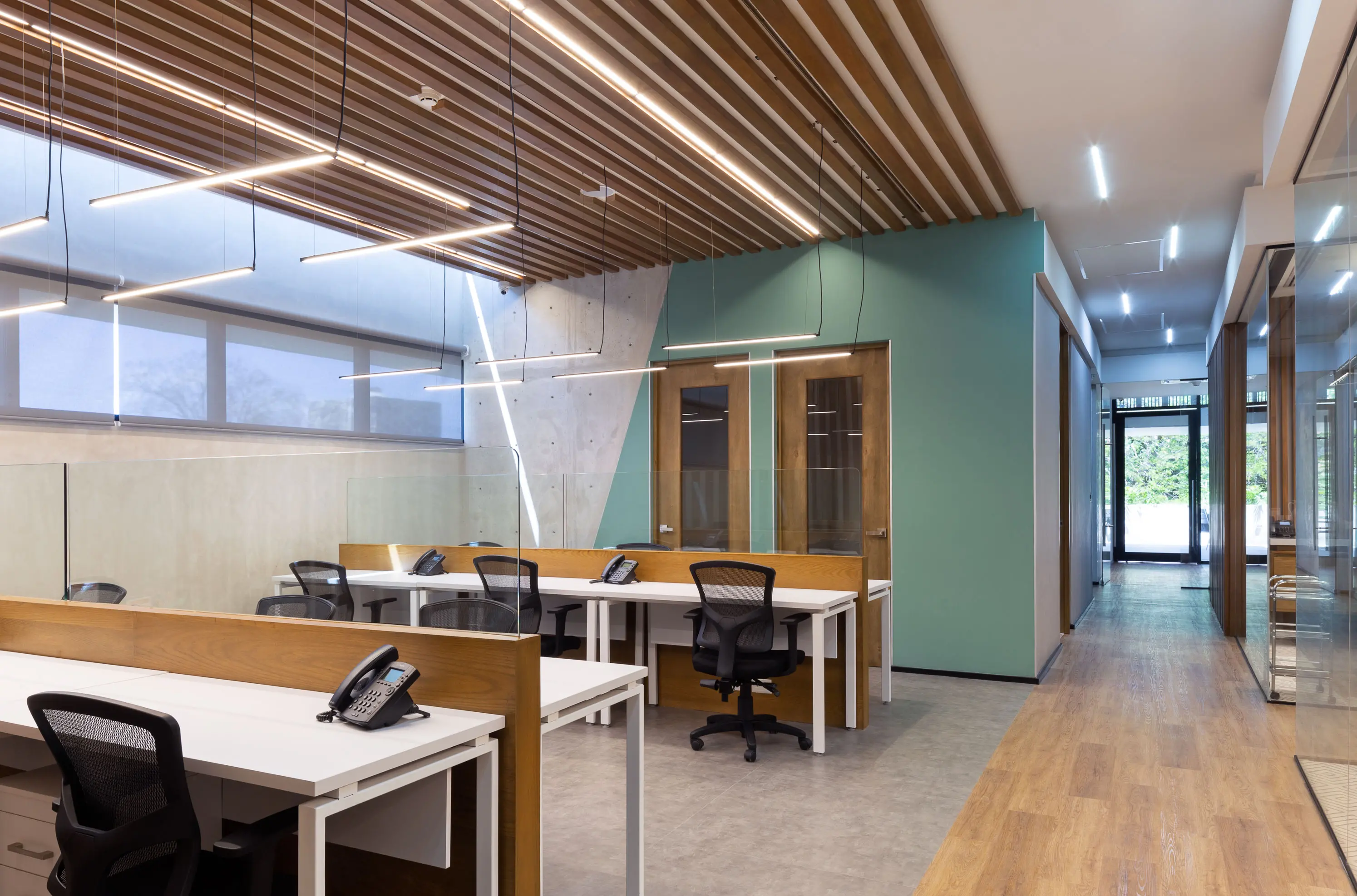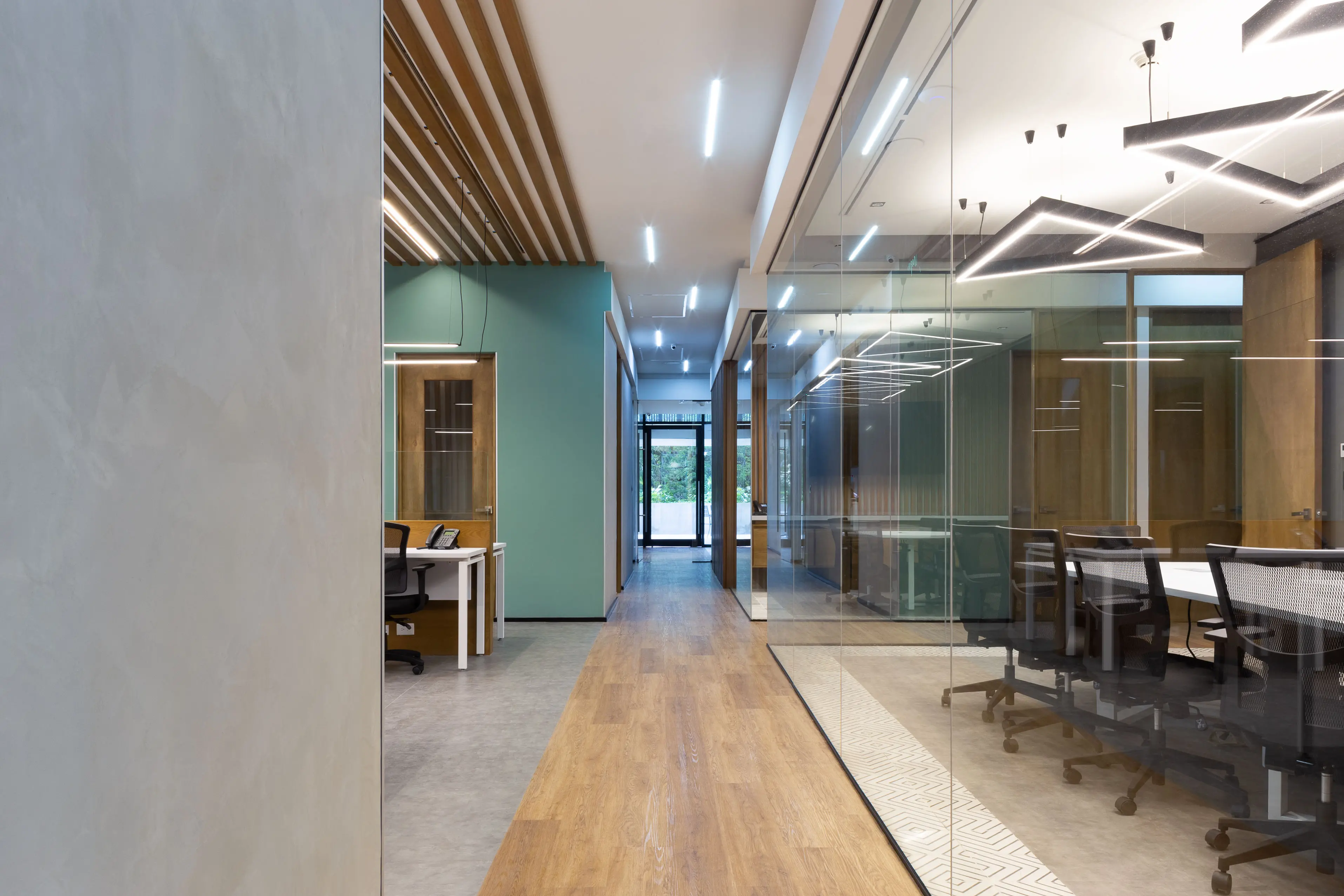 El proyecto integra oficinas privadas, coworking y salas de juntas dentro de un entorno sofisticado que equilibra diseño y funcionalidad.
