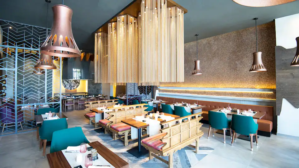 El diseño incluye restaurantes temáticos de alta gama, como el asiático Grill Zilara y Grill Ziva, donde la propuesta culinaria se complementa con un interiorismo que refleja la riqueza cultural y natural del entorno.