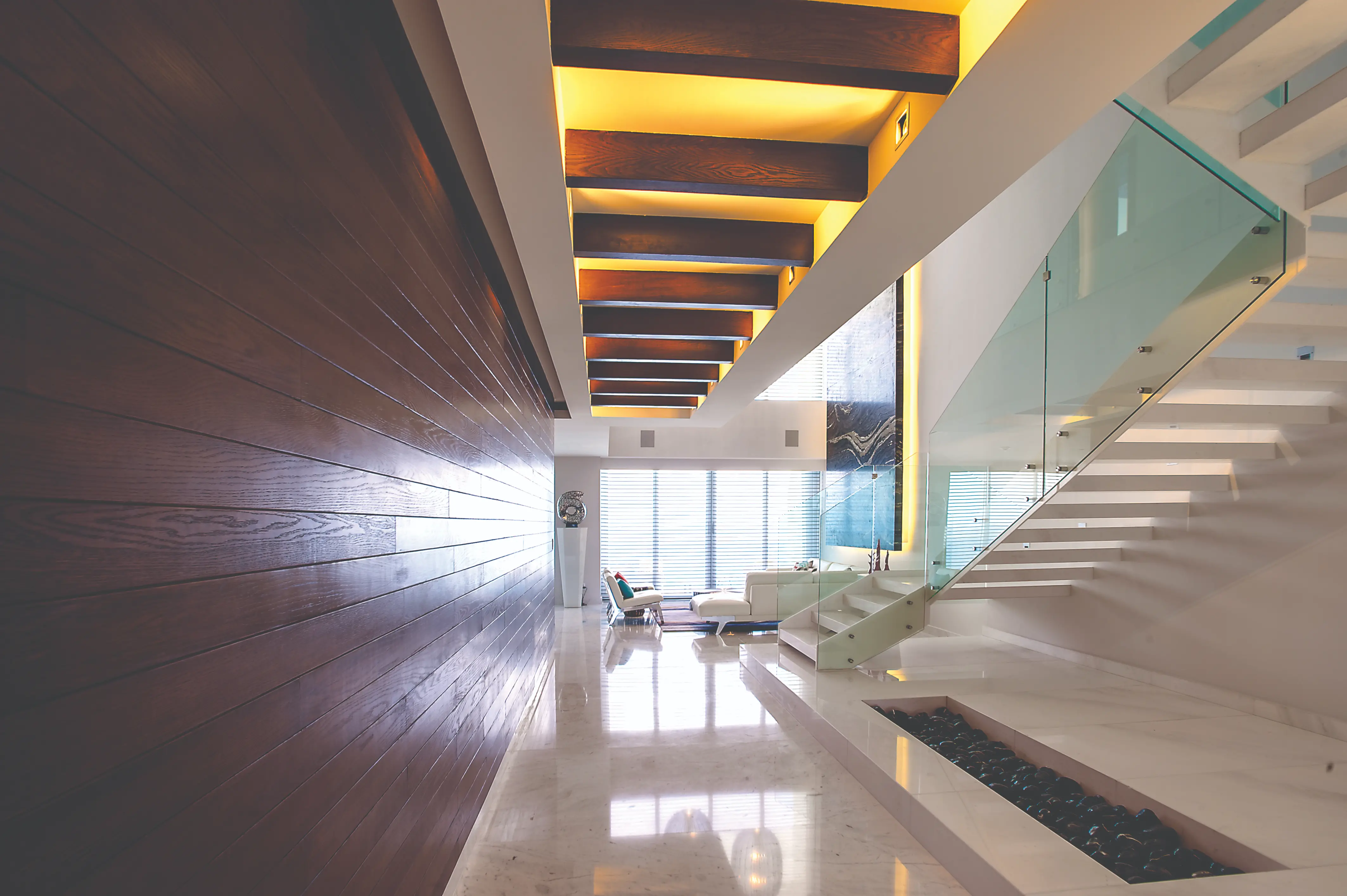 Residencia contemporánea que combina materiales naturales, tonos neutros y luz cálida para crear un ambiente sereno y sofisticado. Los espacios abiertos y la integración de madera y piedra transmiten frescura y confort, logrando un equilibrio entre modernidad y naturaleza.